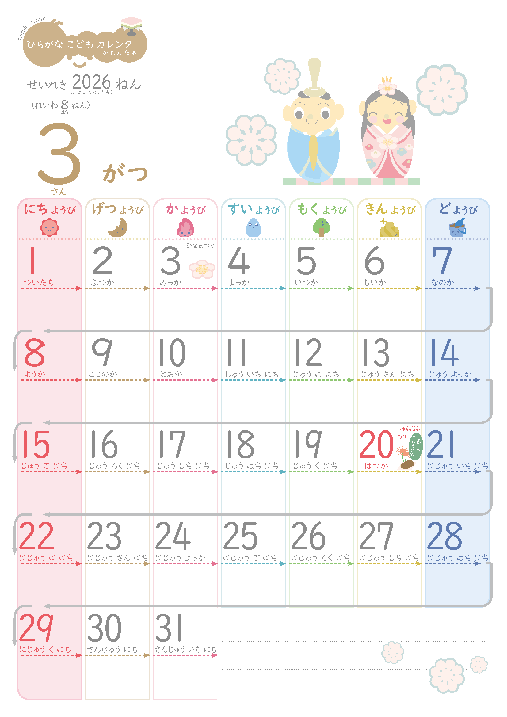 前回の色分けよりも更に工夫し、曜日毎のテーマカラーでミニキャラを作ったり日付下の矢印も同じカラーにしたり。